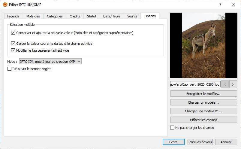 XnviewMP complète les champs vides, ceux déjà remplis restent inchangés. Si vous désirez écraser des champs déjà remplis, utilisez l’onglet Options :