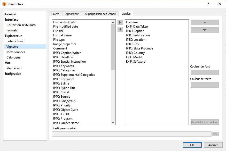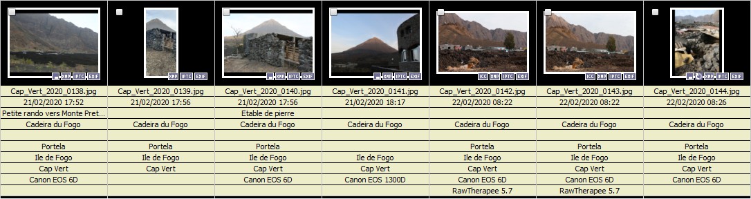 A ce stade, vous pouvez avoir une vue d’ensemble des photos, selon la sélection du sous-répertoire de la fenêtre de gauche. Chaque vignette comporte les champs d’étiquettes choisies précédemment (nom du fichier, date & heure, légende etc...). Ces champs sont encore vides, mais seront bien remplis par la suite.